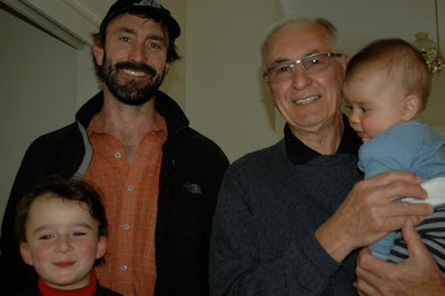 Actually we've all been sick. Right now it's my turn, and it's been going on for almost two weeks, and I missed a very very fun barbie today as a result, and I'm just about fed up with it. Anyway, Alisa got a great "three generations of blokes" shot with my Dad.
